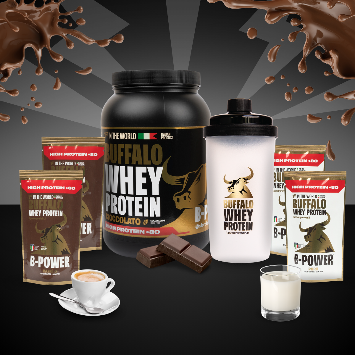 Box Promo Cioccolato +80 Buffalo Whey - Barattolo di Proteine in Polvere da 1kg + Omaggio 1 Shaker, 2 Bustine Caffè e 2 Puro
