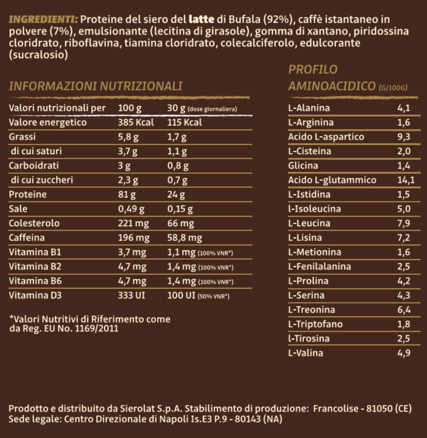 Proteine del siero del latte di bufala (92%), caffè istantaneo in polvere (7%), emulsionante (lecitina di girasole), gomma di xantano, piridossina cloridrato, riboflavina, tiamina cloridrato, colecalciferolo, edulcorante (sucralosio)